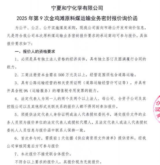寧夏和寧化學(xué)有限公司2025年第9次石拉烏素原料煤運(yùn)輸業(yè)務(wù)密封報(bào)價(jià)詢價(jià)函.pdf