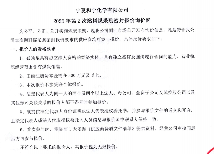寧夏和寧化學(xué)有限公司2025年第1次石拉烏素原料煤運(yùn)輸業(yè)務(wù)密封報價詢價函 [全文]