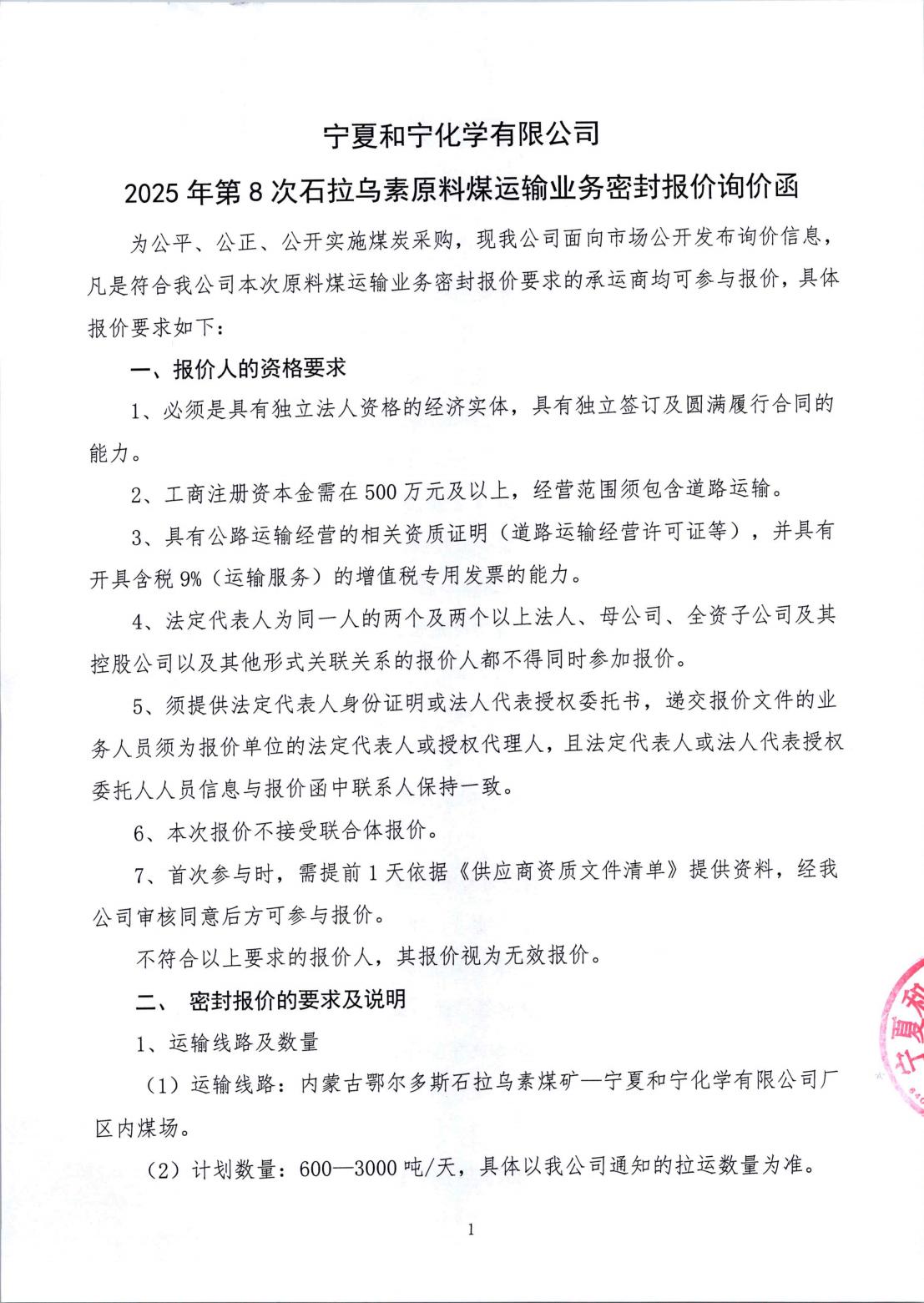 寧夏和寧化學(xué)有限公司2025年第8次石拉烏素原料煤運(yùn)輸業(yè)務(wù)密封報(bào)價(jià)詢價(jià)函附件下載 [全文]