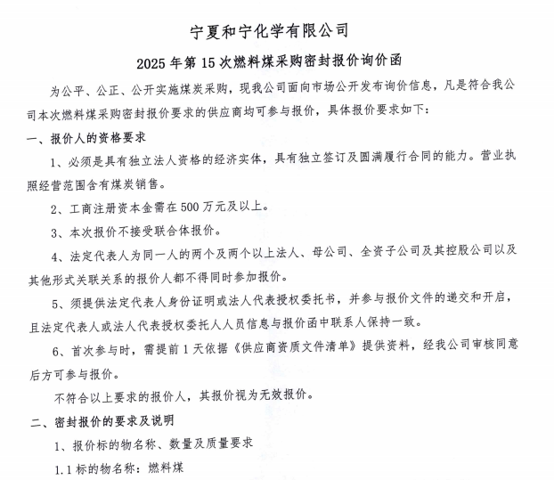 寧夏和寧化學(xué)有限公司2025年第15次燃料煤采購(gòu)密封報(bào)價(jià)詢價(jià)函.pdf [全文]