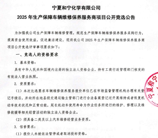 寧夏和寧化學有限公司2025 年公務車輛維修保養(yǎng)服務商項目公開競選公告.pdf [全文]
