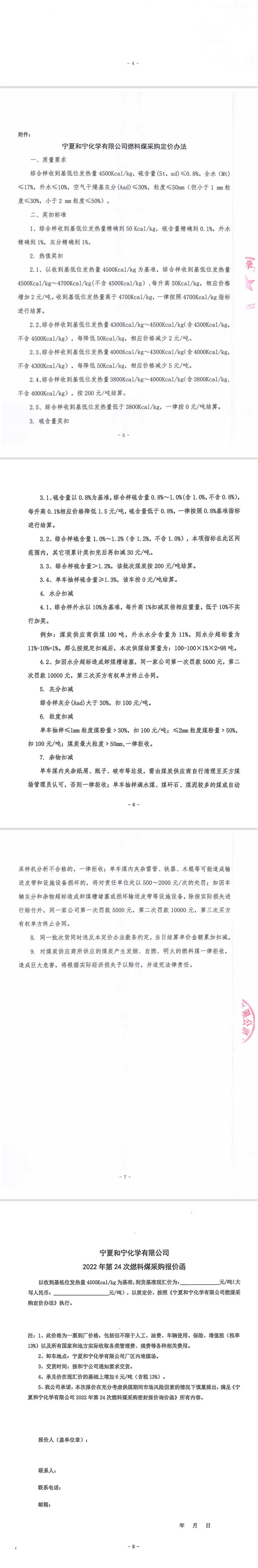 寧夏和寧化學(xué)有限公司2022年第24次燃料煤采購密封報價詢價函