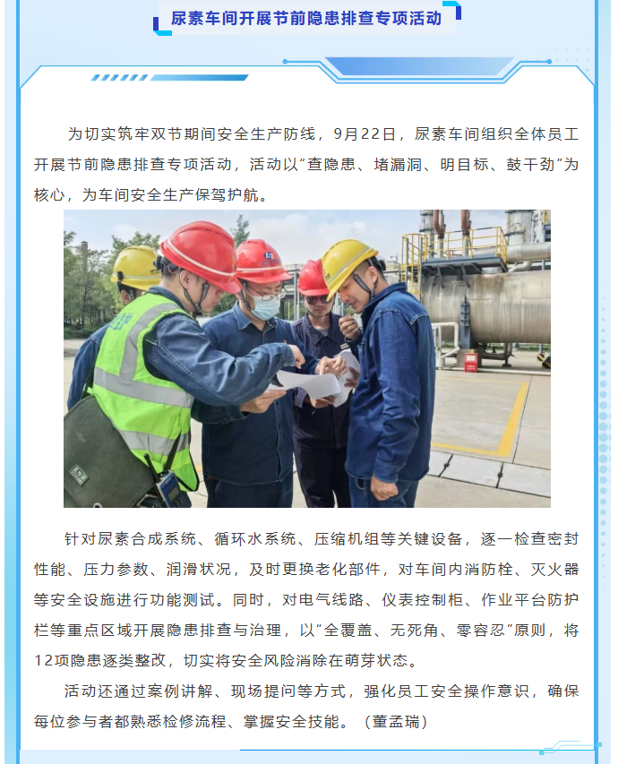 尿素車(chē)間開(kāi)展節(jié)前隱患排查專(zhuān)項(xiàng)活動(dòng)