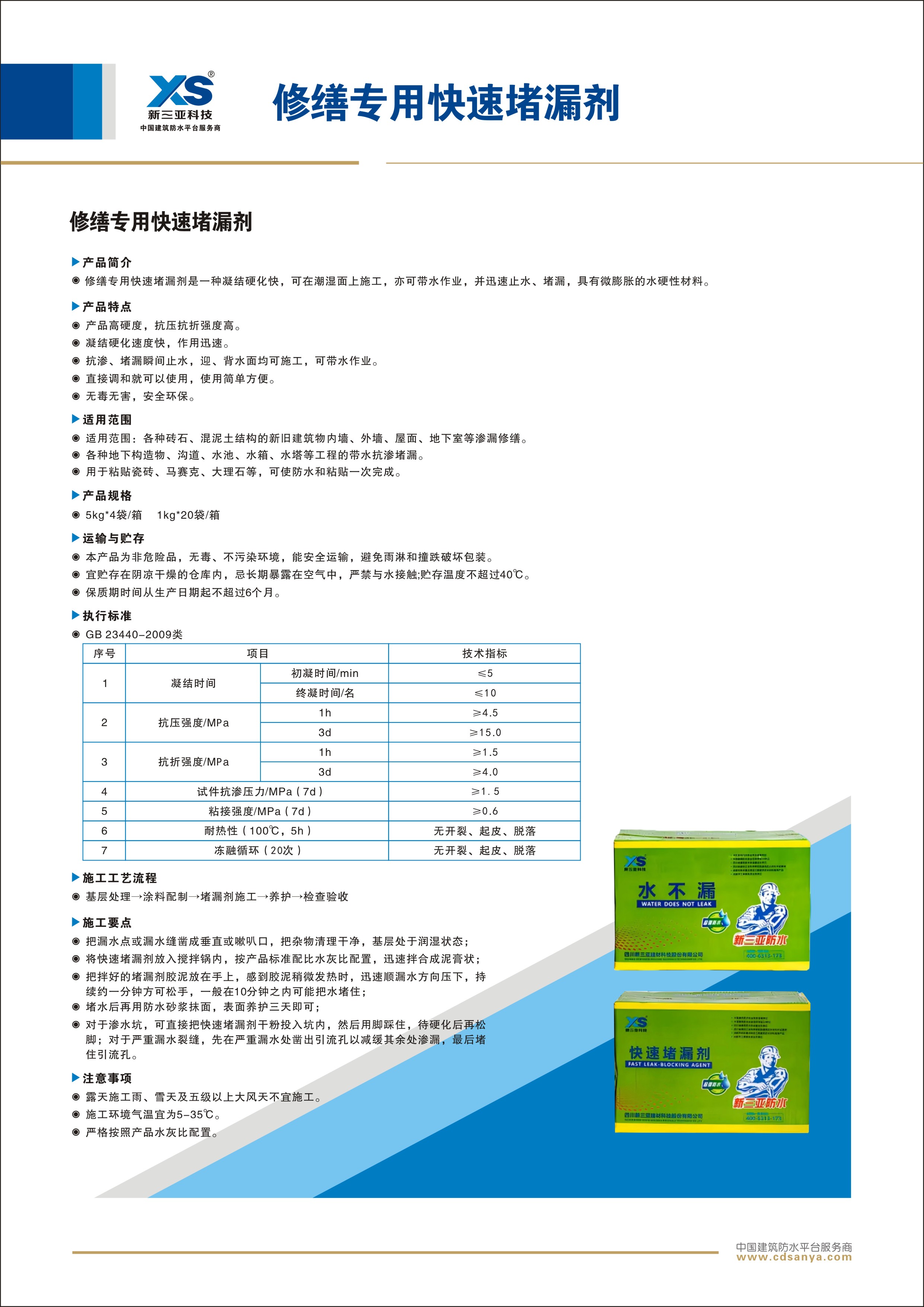 產(chǎn)品簡介: 修繕專用快速堵漏劑是一種凝結(jié)硬化快,小時(shí)強(qiáng)度高,可在潮濕面上施工,亦可帶水作業(yè),并迅速止水、堵漏,具有微膨脹的水硬性材料。 規(guī)格:水不漏(速凝型):20kg/件(5kg×4袋) |