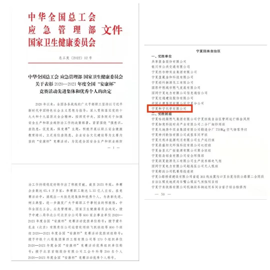 炎炎盛夏大修日,塞上和寧喜訊傳。8月6日,正當(dāng)和寧公司干部員工熱火朝天奮戰(zhàn)在年度裝置大修現(xiàn)場(chǎng)之際,從上級(jí)工會(huì)傳來(lái)喜訊,和寧公司榮獲2020-2021年度全國(guó)“安康杯”競(jìng)賽活動(dòng)優(yōu)勝單位,受到中華全國(guó)總工會(huì)、應(yīng)急管理部、國(guó)家衛(wèi)生健康委員會(huì)通報(bào)表彰,和寧公司現(xiàn)場(chǎng)一片沸騰,大家或奔走相告、或微信群轉(zhuǎn)發(fā),熱烈慶祝公司獲... [全文]