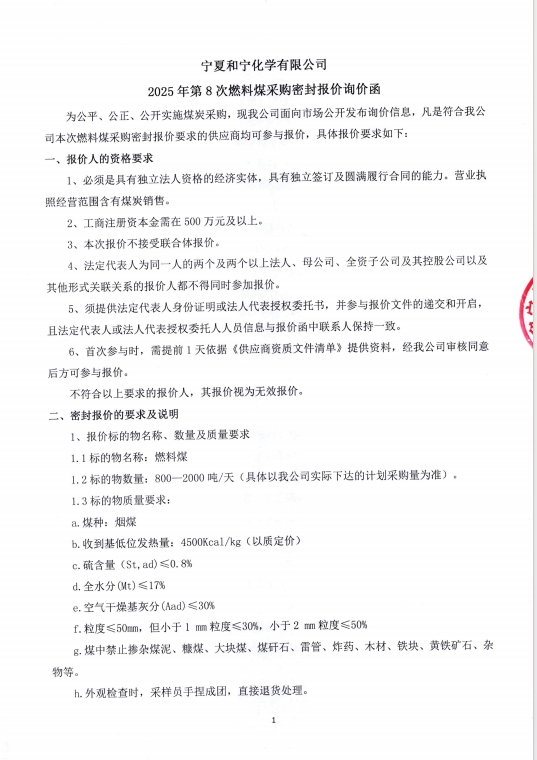 寧夏和寧化學(xué)有限公司2025年第8次燃料煤采購密封報(bào)價(jià)詢價(jià)函附件下載.pdf [全文]
