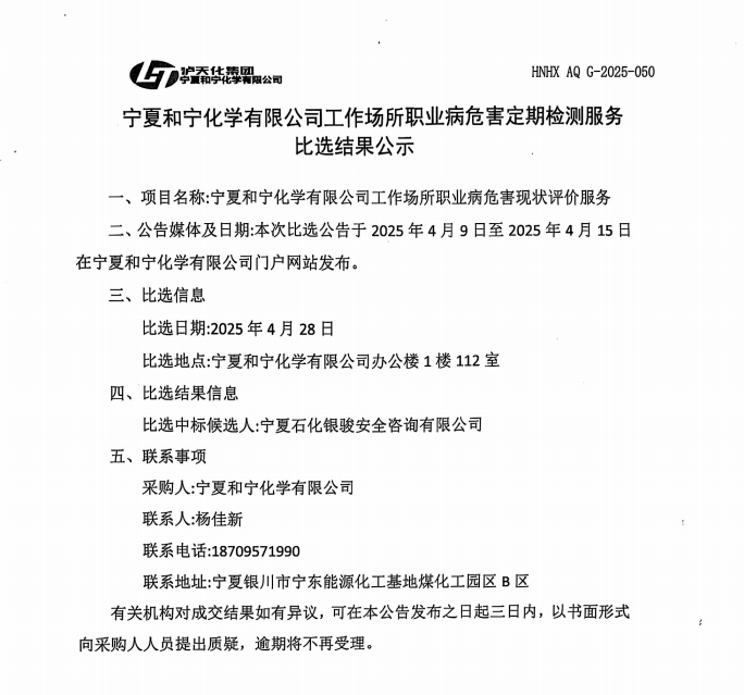 寧夏和寧化學(xué)有限公司工作場所職業(yè)病危害定期檢測服務(wù)比選結(jié)果公示.pdf [全文]