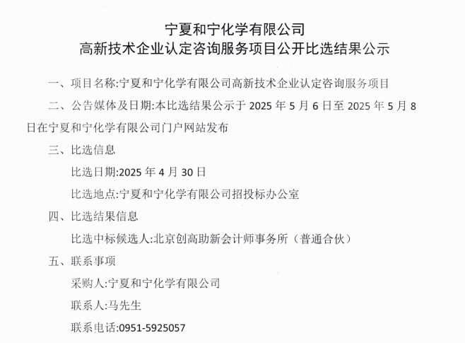 寧夏和寧化學(xué)有限公司高新技術(shù)企業(yè)認(rèn)定咨詢服務(wù)項(xiàng)目公開比選結(jié)果公示.pdf [全文]