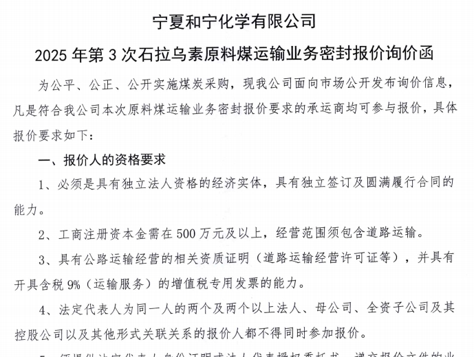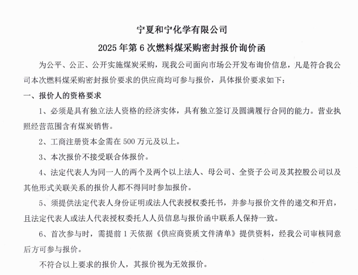 寧夏和寧化學(xué)有限公司2025年第6次燃料煤采購密封報(bào)價(jià)詢價(jià)函.pdf [全文]