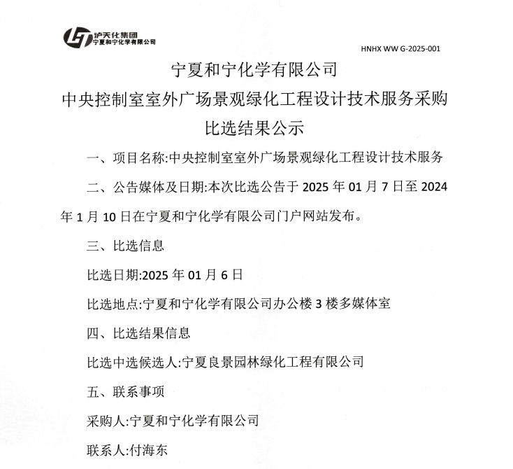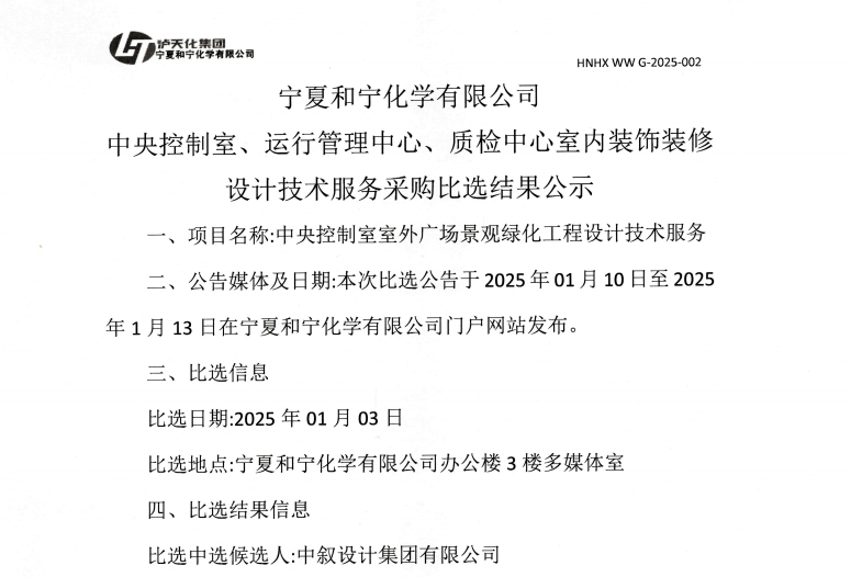 寧夏和寧化學(xué)有限公司中央控制室室外廣場景觀綠化工程設(shè)計(jì)技術(shù)服務(wù)采購比選結(jié)果公示.pdf [全文]