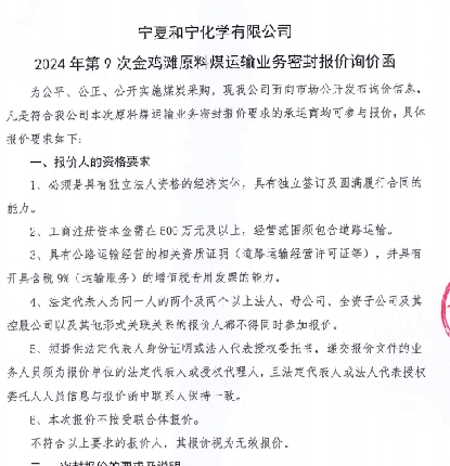 寧夏和寧化學(xué)有限公司2024年第9次金雞灘原料煤運(yùn)輸業(yè)務(wù)密封報(bào)價(jià)詢價(jià)函.pdf [全文]