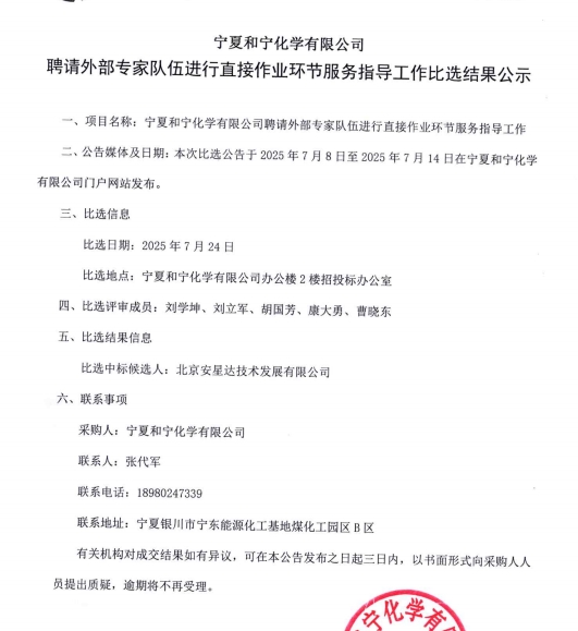 寧夏和寧化學(xué)有限公司聘請(qǐng)外部專家隊(duì)伍進(jìn)行直接作業(yè)環(huán)節(jié)服務(wù)指導(dǎo)工作比選結(jié)果公示.pdf [全文]