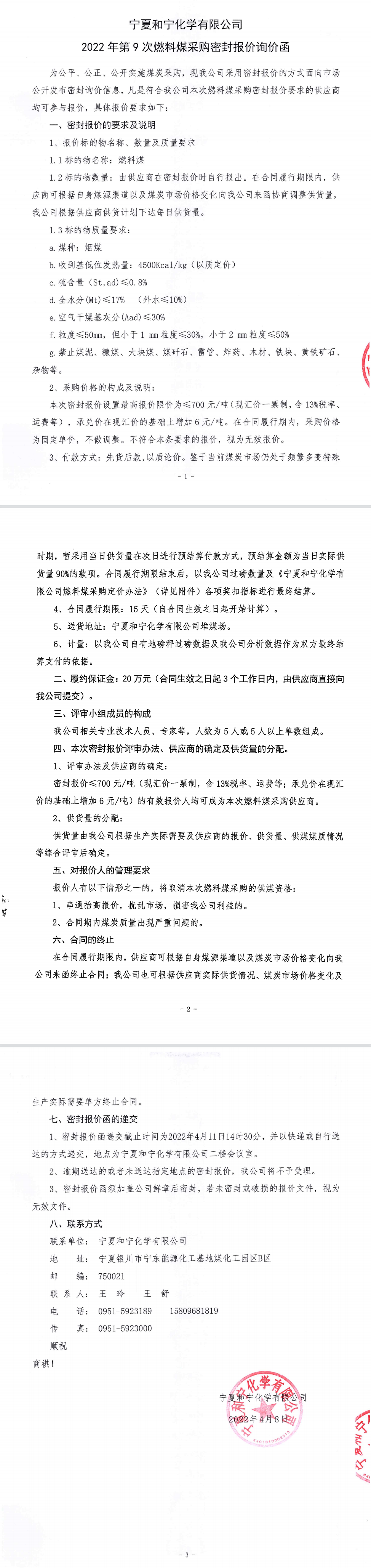 寧夏和寧化學有限公司2022年第9次燃料煤采購密封報價詢價函