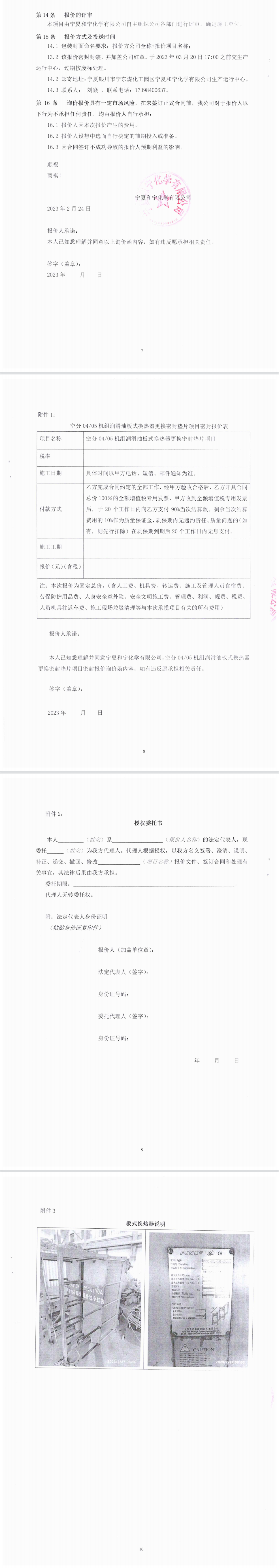 空分0405機(jī)組潤滑油換熱器更換密封墊片項(xiàng)目 - 詢價(jià)函